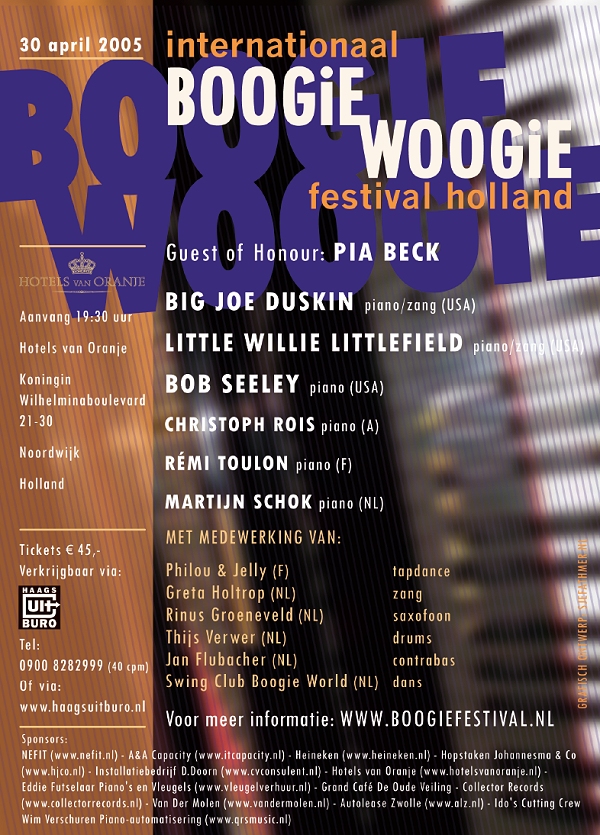 Op 30 april 2005 vond het Internationale Boogie Woogie Festival Holland plaats in de Hotels van Oranje te Noordwijk. Deze tweede editie van het festival was wederom uitverkocht. Hieronder kunt u uitgebreid terugblikken op het festival 2005. |