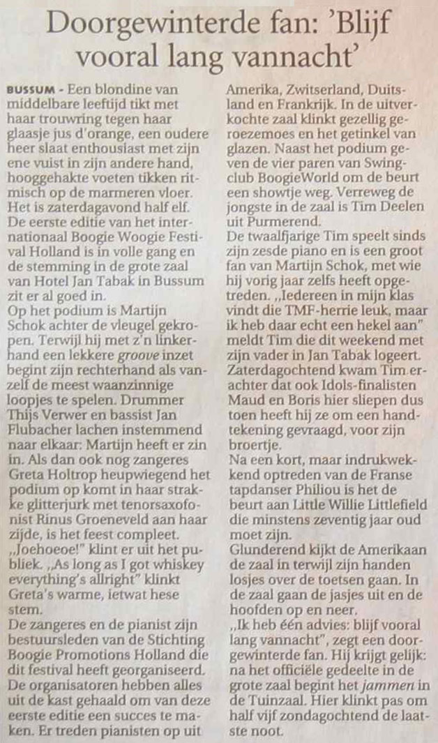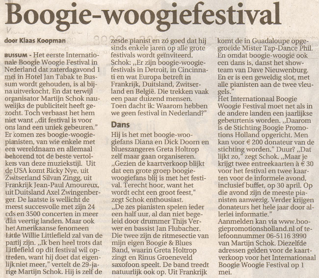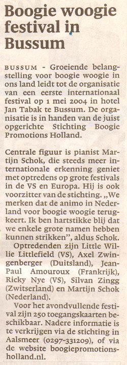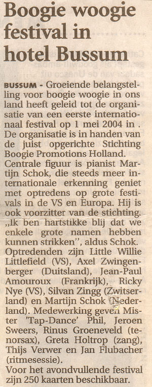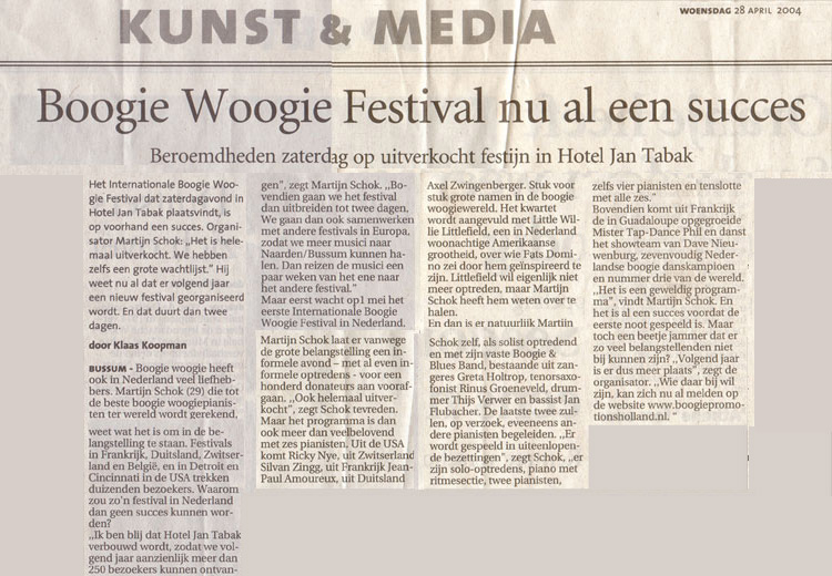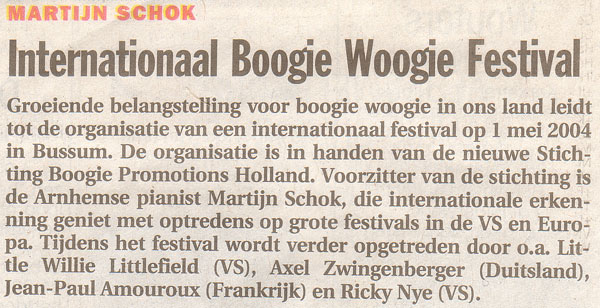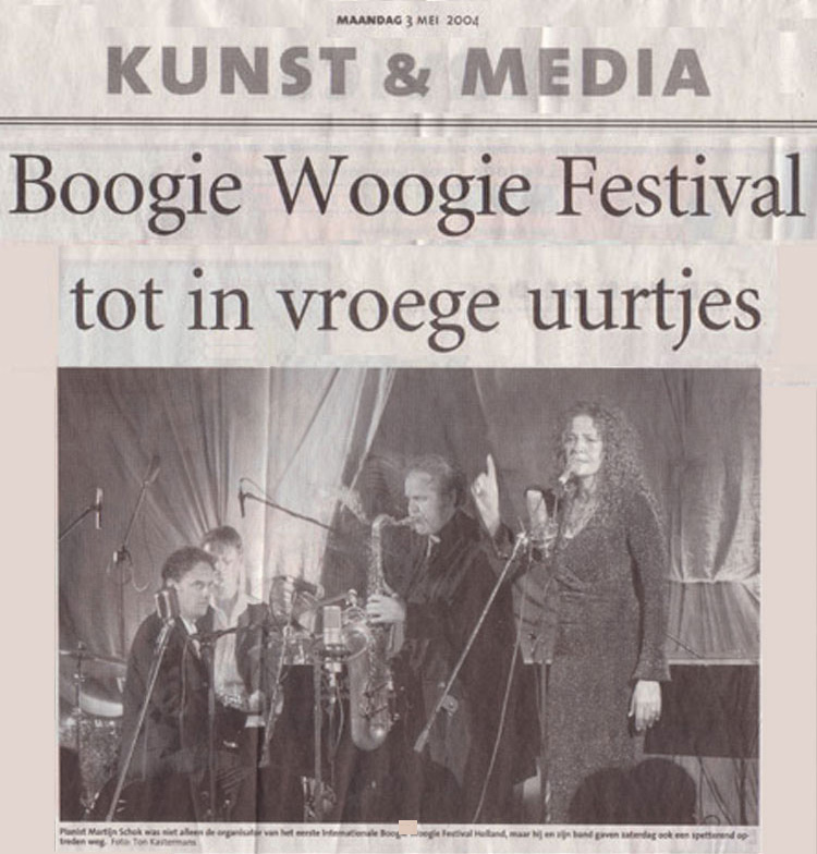 Internationaal Boogie Woogie Festival 2004 Het Internationale Boogie Woogie Festival Holland 2004 was een groot (en uitverkocht) succes. Hieronder vindt u informatie over deze eerste editie van het festival...